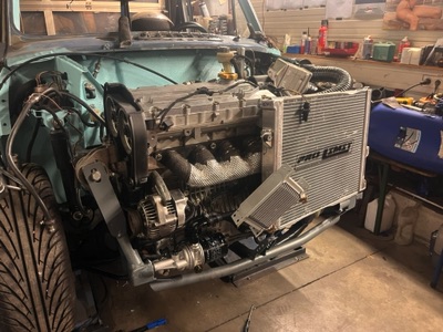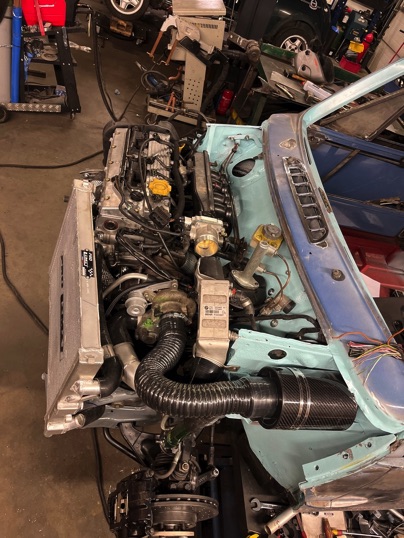 Das Automatikgetriebe und der Saugmotor wurden ausgebaut und gegen ein verstärktes 5 Gang Getriebe mit Freelander Schwungrad/Kupplung und einem neuen 18K4g Motor, ausgetauscht. Eine neue Abagsanlage mit Turbo-Aufladung wurde angefertigt. Ziel war es alles unter die Standard Schnauze zu bekommen. ;)