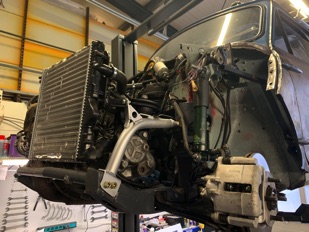Das Automatikgetriebe und der Saugmotor wurden ausgebaut und gegen ein verstärktes 5 Gang Getriebe mit Freelander Schwungrad/Kupplung und einem neuen 18K4g Motor, ausgetauscht. Eine neue Abagsanlage mit Turbo-Aufladung wurde angefertigt. Ziel war es alles unter die Standard Schnauze zu bekommen. ;)